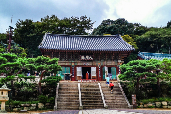 Beomeosa is one of the largest temples and most buildings here dated from the seventeenth and eighteenth centuries.  Since Beomeosa is built on a mountain slope, the buildings are arranged on three elevations of the mountain: low, middle and high. As the result of this kind of geometric placement of the buildings, the temple features a certain coziness. The first thing that you’ll notice as you step into Beomeosa is the substantial Iljoomoon (One Pillar Gate). The gate is built upon four gigantic foundation stones, and with a majestic roof crowning the top, from any perspective it looks just like a practicing monk, standing with unmoving mind regardless of what appears. Once you set foot in the Daeoongjeon (Main Buddha Hall), you can really sense the devotion of many people over the years. It’s certainly true of the people you see ardently chanting and praying in the Buddha Hall, and it’s also true of the meticulously depicted wall paintings that cover every corner of the building’s interior.