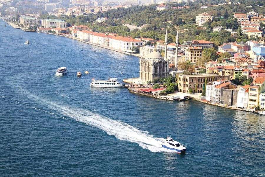 A scenic voyage between Europe and Asia with palaces, mosques, and waterfront mansions along the strait.
